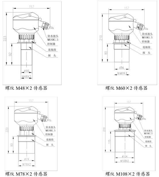 SKCYW系列超聲波液位計(jì) ; SKCYW系列超聲波液位計(jì)是由微處理器控制的數(shù)字液位儀表。在測量中脈沖超聲波由傳感器發(fā)出,聲波經(jīng)液體表面反射后被同一傳感器接收并轉(zhuǎn)換成電信號。超聲波液位計(jì)具有自動功率調(diào)整,溫度補(bǔ)償,抗干擾等功能。由于采用非接觸測量,被測介質(zhì)幾乎不受控制,可廣泛應(yīng)用于水環(huán)境、酸堿、泥漿、食品等多種環(huán)境。 1、測量流量、液位、低表壓、真空和比重 2、兩線制最大量程可達(dá)30m 3、四線制最大量程可達(dá)40m 4、最小分辨率1mm 5、LCD/LED大顯示屏 6、智能信號處理技術(shù) 7、配有高低位雙繼電器(僅四線制) 8、全塑料防腐外殼(防護(hù)等級lP67) 9、換能器結(jié)構(gòu)(小量程物位計(jì)法蘭安裝時(shí),對法蘭接管長度無要求) 10、簡單的按鍵設(shè)定參數(shù)(無需等待容器排空或加滿,無需附加的遙控器) 11、靈活的安裝方式(螺紋/法蘭、固定孔/支架) 螺紋尺寸:M48*2 M60*2 超聲波液位計(jì)技術(shù)參數(shù)