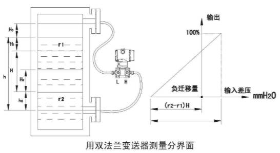 c、雙插入筒型法蘭液位變送器測量如圖: