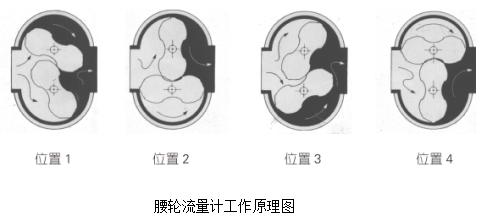 智能氣體腰輪(羅茨)流量計,主要由殼體、共軛轉(zhuǎn)子、計數(shù)器和智能流量轉(zhuǎn)換器等部件構(gòu)成。裝于計量室內(nèi)的一對共軛轉(zhuǎn)子在流通氣體的出入口壓差(P入>P出)作用下,通過精密加工的調(diào)校齒輪使轉(zhuǎn)子保持正確的相對位置。轉(zhuǎn)子間、轉(zhuǎn)子與殼體、轉(zhuǎn)子與墻板間保持最佳工作間隙,實現(xiàn)了連續(xù)的無接觸密封。轉(zhuǎn)子每轉(zhuǎn)動一周,則輸出四倍計量室有效容積的氣體,轉(zhuǎn)子的轉(zhuǎn)數(shù)通過磁性密封聯(lián)軸裝置及減速機(jī)構(gòu),傳遞到智能流量轉(zhuǎn)換器,從而顯示輸出氣體的累計體積量。其計量過程和工作原理如圖所示(圖中僅表示了四分之一周期)。