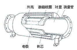 防腐型電磁流量計(jì)由傳感器和轉(zhuǎn)換器組成。而傳感器主要組成部分是:測(cè)量管、電極、勵(lì)磁線圈、鐵芯與磁軛殼體。傳感器安裝在測(cè)量管道上,轉(zhuǎn)換器可以與傳感器組合連接在一起稱為一體型電磁流量計(jì),轉(zhuǎn)換器被安裝在離傳感器30米內(nèi)或100米內(nèi)的場(chǎng)合,兩者間由屏蔽電纜連接稱為分體式電磁流計(jì)。