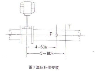 溫度壓力補(bǔ)償安裝:P-壓力變送器,T-溫度傳感器,安裝在后直管段上,見圖7。