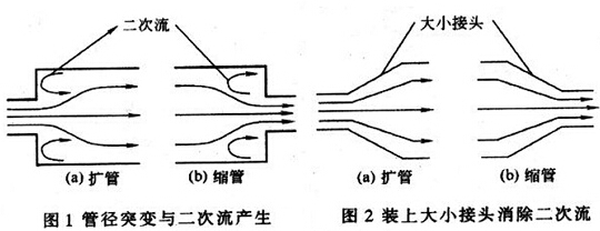 無論是變大還是變小,都會(huì)產(chǎn)生二次流動(dòng),干擾正常的流速分布。通常在遇到這類情況的時(shí)候,我們會(huì)為管道安裝合適的大小接頭,如圖2所示。為流體做合理過渡,使流速能夠恢復(fù)到正常狀態(tài),保證測(cè)量數(shù)據(jù)的準(zhǔn)確與穩(wěn)定。