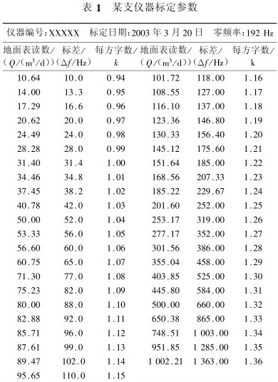 電磁流量計是一種直接測量流體流量的儀器,因此所測流量可直接讀取。而用渦輪流量計求取流量時,首先需要經(jīng)過大量的線性回歸和公式計算,計算煩瑣且精度不高,給資料的解釋工作帶來較大難度。電磁流量計一般要經(jīng)過標(biāo)定才能在現(xiàn)場應(yīng)用,某支儀器的標(biāo)定參數(shù)見表1。