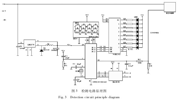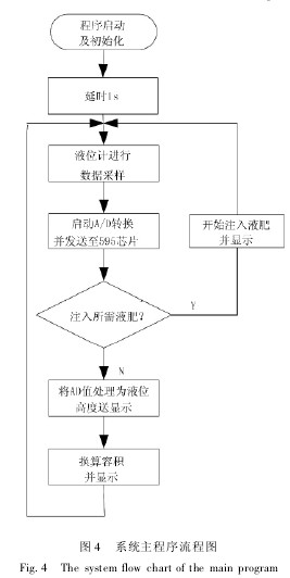 0引言 液位包括液位信號(hào)器和連續(xù)液位測(cè)量?jī)煞N。液位信號(hào)器是對(duì)幾個(gè)固定位置的液位進(jìn)行測(cè)量,用于液位的上、下限報(bào)警等;連續(xù)液位測(cè)量是對(duì)液位連續(xù)地進(jìn)行測(cè)量,廣泛應(yīng)用于農(nóng)田灌溉、定量施量、高爐沖渣水位測(cè)量、環(huán)境監(jiān)測(cè)等農(nóng)業(yè)生產(chǎn)領(lǐng)域,具有非常重要的意義。目前,對(duì)液位測(cè)量的精度要求不僅愈來愈高,且需要測(cè)量?jī)x能夠適應(yīng)一些特殊環(huán)境,如高溫、高壓、強(qiáng)放射性及強(qiáng)腐蝕性等條件。液態(tài)肥因其生產(chǎn)費(fèi)用低、肥效高、易吸收、節(jié)支增產(chǎn)效果顯著及施用過程中可以根據(jù)需要加入土壤所缺少的植物營(yíng)養(yǎng)元素等優(yōu)勢(shì)迅速得到了廣泛應(yīng)用。而變量施肥作為農(nóng)業(yè)的重要部分,其技術(shù)基礎(chǔ)就是對(duì)液肥液位的準(zhǔn)確控制。目前市場(chǎng)上,液位控制系統(tǒng)大致可分為以下兩種: 1)機(jī)械式控制系統(tǒng)。機(jī)械式控制系統(tǒng)結(jié)構(gòu)簡(jiǎn)單、成本低廉;但這種控制裝置故障多、誤動(dòng)作多,且只能單獨(dú)控制,與計(jì)算機(jī)進(jìn)行通信較難實(shí)現(xiàn)。 2)交流調(diào)壓/變頻調(diào)速控制系統(tǒng)。該系統(tǒng)是通過安裝在水泵出口管道上的壓力傳感器,把出口壓力變成標(biāo)準(zhǔn)工業(yè)電信號(hào)的模擬信號(hào),經(jīng)過前置放大、多路切換、A/D變換成數(shù)字信號(hào)傳送到單片機(jī),經(jīng)單片機(jī)運(yùn)算與給定量的比較,進(jìn)行PID運(yùn)算,得出調(diào)節(jié)參量;經(jīng)由D/A變換給調(diào)壓/變頻調(diào)速裝置輸入給定端,控制其輸出電壓變化,來調(diào)節(jié)電機(jī)的轉(zhuǎn)速,以達(dá)到控制水位的目的。 本文以液態(tài)施肥機(jī)為依托,針對(duì)一定體積的液肥進(jìn)行液位試驗(yàn),通過以單片機(jī)和投入式液位計(jì)為主要硬件資源設(shè)計(jì)硬件電路,畫出相應(yīng)的軟件流程圖進(jìn)行測(cè)試。數(shù)據(jù)分析驗(yàn)證表明:該傳感器在液肥液位測(cè)量中安裝維護(hù)方便,能適應(yīng)液肥這種特殊環(huán)境,其容量和液位高度的測(cè)量誤差也滿足實(shí)際要求。 1系統(tǒng)工作原理及組成 微壓式液位計(jì)采用的是壓力敏感元件實(shí)現(xiàn)力-電轉(zhuǎn)換。傳感器的液位量程是0~1.3m,且這段量程液位所對(duì)應(yīng)的深度約合壓力相比其他要小很多,因而稱其為“微壓式”。本系統(tǒng)是所選的正是微壓式傳感器,它將液位信號(hào)轉(zhuǎn)換為4~20mA標(biāo)準(zhǔn)電信號(hào)輸出。 若設(shè)所測(cè)液體密度為ρ,液位高度為h,大氣壓為ρ0,重力加速度為g,則液體所受壓力p=ρgh+ρ0。這時(shí),為抵消大氣壓力變化所帶來的測(cè)量誤差,傳感器變送器部分采用導(dǎo)氣電纜將大氣壓力ρ0引入敏感元件的負(fù)壓腔,進(jìn)而使p=ρgh。顯然,若已知液體密度,通過測(cè)取壓力p就可換算出相應(yīng)的液位高度。 1.1單片機(jī)選型 該系統(tǒng)結(jié)構(gòu)相對(duì)簡(jiǎn)單、運(yùn)行速度快,考慮到功能和成本兼顧,采用以擴(kuò)展性51系列單片機(jī)STC12C5412AD為核心控制元件。該芯片具有12kB用戶可自行安排的FLASH及FEPROM空間比例;在同樣的工作頻率下,平均指令運(yùn)算速度是普通8051的8~12倍[4],滿足系統(tǒng)對(duì)數(shù)據(jù)處理的要求,且掉電模式可由外部中斷喚醒,適用車載信息系統(tǒng)。系統(tǒng)設(shè)計(jì)方案圖如圖1所 1.2投入式液位計(jì)選型 其基于所測(cè)液體靜壓與該液體的高度成比例的原理,再將靜壓轉(zhuǎn)換為電信號(hào),實(shí)現(xiàn)非電量到電量的變換,利用這一特性來完成對(duì)液位的測(cè)量。主要技術(shù)參數(shù)如下:量程1.3m,精度0.5%Fs,電壓18~36VDC,輸出4~20mA。 其優(yōu)點(diǎn)包括:①能實(shí)時(shí)測(cè)量罐內(nèi)各點(diǎn)液位;②直流4~20mA標(biāo)準(zhǔn)電流信號(hào)輸出;③密封性好,測(cè)量元件不與液肥直接接觸,避免了液肥對(duì)元件的腐蝕。 2硬件電路設(shè)計(jì) 2.1電源電路設(shè)計(jì) 電源電路圖如圖2所示。圖2中,為了保證液位傳感器能獲得24V的直流供電,選用具有DC-DC單片控制電路功能的MC34063芯片,片內(nèi)包含有溫度補(bǔ)償帶隙基準(zhǔn)源,能輸出1.5A的開關(guān)電源,且是使用最少的外接元件構(gòu)成的升壓變換器、降壓變換器和電源反向器[5]。 本系統(tǒng)電源電路采用具有升壓轉(zhuǎn)換作用的MC34063芯片,與電感L、二極管D3、三極管TIP122一起構(gòu)成電源電路。若TIP122導(dǎo)通時(shí),+12V的輸入電壓經(jīng)采樣限流電阻R1、R2,流經(jīng)電感L,隨著電感L電流增加,其兩端進(jìn)行儲(chǔ)存能量。此時(shí),二極管D3是防止電容C3對(duì)地放電,并由電容C3向負(fù)載供電;若TIP122斷開時(shí),電感L及12V的輸入電壓對(duì)電容C3充電的同時(shí)電容C3對(duì)負(fù)載供電,負(fù)載電壓穩(wěn)定在+24V,穩(wěn)壓的負(fù)反饋信號(hào)是電阻R7、R8的分壓輸入到MC36063的5腳。 2.2檢測(cè)電路設(shè)計(jì) 硬件部分的核心為STC12C5412AD,工作電壓由LM2576從24V轉(zhuǎn)變?yōu)?V來提供。同時(shí),用MCU的3個(gè)輸出引腳P1.1、P1.2、P1.3連接串并轉(zhuǎn)換芯片74HC595,就可實(shí)現(xiàn)對(