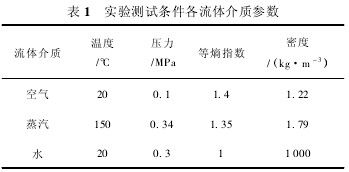 為驗(yàn)證仿真分析得到的結(jié)論,利用負(fù)壓法音速噴嘴氣體流量計(jì)量標(biāo)準(zhǔn)裝置、蒸汽實(shí)流計(jì)量標(biāo)準(zhǔn)裝置和水流量計(jì)量標(biāo)準(zhǔn)裝置對(duì)該結(jié)構(gòu)類(lèi)型的渦街流量計(jì)進(jìn)行三種介質(zhì)的實(shí)驗(yàn)研究,各測(cè)試條件參數(shù)如表 1 所示。