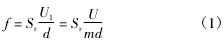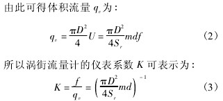 式中: f 為旋渦頻率; Sr為斯特勞哈爾數(shù); m 為旋渦發(fā)生體兩側(cè)弓形面積與管道橫截面面積之比,不可壓縮流體中,由于流體密度 ρ 不變,由連續(xù)性方程可得到 m = U/U1。