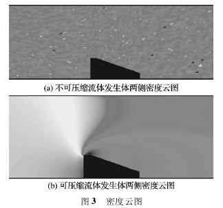 根據(jù)公式 ( 1) 可知,影響渦街流量計(jì)旋渦頻率的是發(fā)生體兩側(cè)的流速 U1和發(fā)生體的結(jié)構(gòu),由于發(fā)生體結(jié)構(gòu)尺寸是固定的,因此頻率只與 U1相關(guān),需要觀測(cè)在相同入口流速 U 的條件下 U1變化來(lái)得到頻率的變化,而速度的變化必然會(huì)導(dǎo)致流體密度的變化,因此可觀測(cè)發(fā)生體兩側(cè)的密度云圖,來(lái)判斷可壓縮性對(duì)渦街流量計(jì)流速 U1的影響,通過(guò)仿真得到如圖 3 ( a) 所示的不可壓縮流體發(fā)生體兩側(cè)的密度云圖和如圖 3 ( b) 所示的可壓縮流體發(fā)生體兩側(cè)的密度云圖。