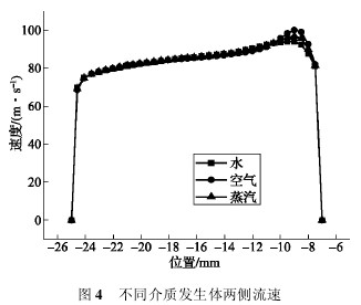 根據(jù)圖 3 得到的結(jié)論,對(duì)渦街流量計(jì)進(jìn)行蒸汽、空氣和水三種介質(zhì)下的軟件仿真,設(shè)置三種介質(zhì)的入口流速均為 50 m/s,取渦街發(fā)生體迎流面?zhèn)壤庵悬c(diǎn)與管壁連線,如圖 2 中線段 ab所示。取該線上的速度值,將蒸汽、空氣和水三種介質(zhì)下的速度曲線進(jìn)行比較,結(jié)果如圖 4所示。
