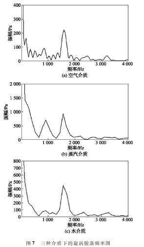對(duì)圖 6 中靜壓數(shù)值進(jìn)行快速傅立葉變換,得到如圖 7 所示的三種介質(zhì)下的旋渦脫落頻率圖。