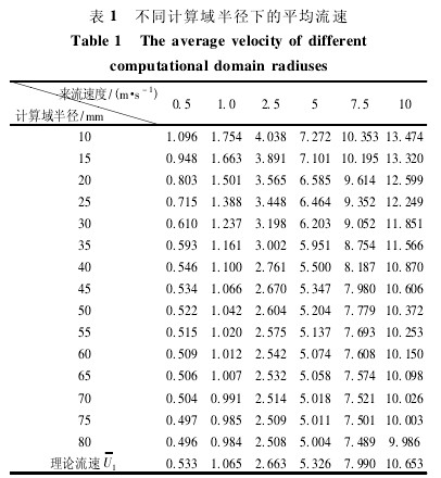 取計(jì)算域半徑在 10 ~ 80 mm 的范圍內(nèi),通過GAMBIT 軟件分別建立模型,再由 FLUENT 軟件分別進(jìn)行仿真,得出在不同半徑的計(jì)算域內(nèi)所對應(yīng)的體積加權(quán)平均流速,如表 1 所示。