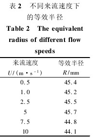 為了得到不同來流速度下的等效半徑,利用MATLAB 對各組數(shù)據(jù)進(jìn)行相應(yīng)理論流速的插值運(yùn)算,得到如表 2 所示的數(shù)據(jù)。