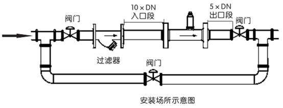 ●水平安裝傳感器要求管道不應(yīng)有目測可察覺的傾斜(一般在5°以內(nèi)),垂直安裝傳感器管道垂直度偏差亦應(yīng)小于5°。在不能停流的場所,應(yīng)裝旁通管和可靠的截止閥(見圖4-7),測量時(shí)要確保旁通管無泄漏。