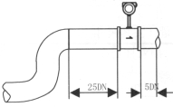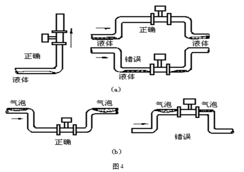 d)測(cè)量液體時(shí),為了保證管內(nèi)充滿液體,所以在垂直或傾斜管道安裝儀表時(shí),應(yīng)該保證液體流動(dòng)方向從下而上。若管道內(nèi)含少量氣體,為了防止氣體進(jìn)入儀表測(cè)量管,儀表應(yīng)安裝在管線的較低處如圖4b所示