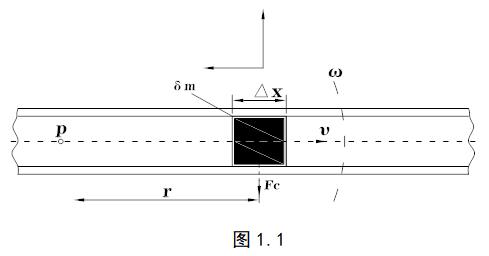 當一個位于以P為固定點(旋轉(zhuǎn)中心)作旋轉(zhuǎn)運動的管子內(nèi)的質(zhì)點做朝向旋轉(zhuǎn)中心或離向旋轉(zhuǎn)中心的運動時,將產(chǎn)生一慣性力,原理如圖1.1: 圖中質(zhì)量為δm的質(zhì)點以勻速υ在管道內(nèi)向右運動,而管道圍繞固定點P以角速度ω旋轉(zhuǎn)。此時這個質(zhì)點將獲得兩個加速度分量: